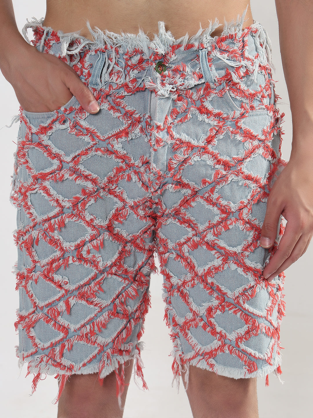Upgrade your summer wardrobe with our Men's Blue Regular Fit Distressed Denim Shorts featuring striking red detailing. These stylish denim shorts are perfect for casual outings. offering a comfortable and trendy fit that's ideal for every man looking to make a statement in their Western wear.