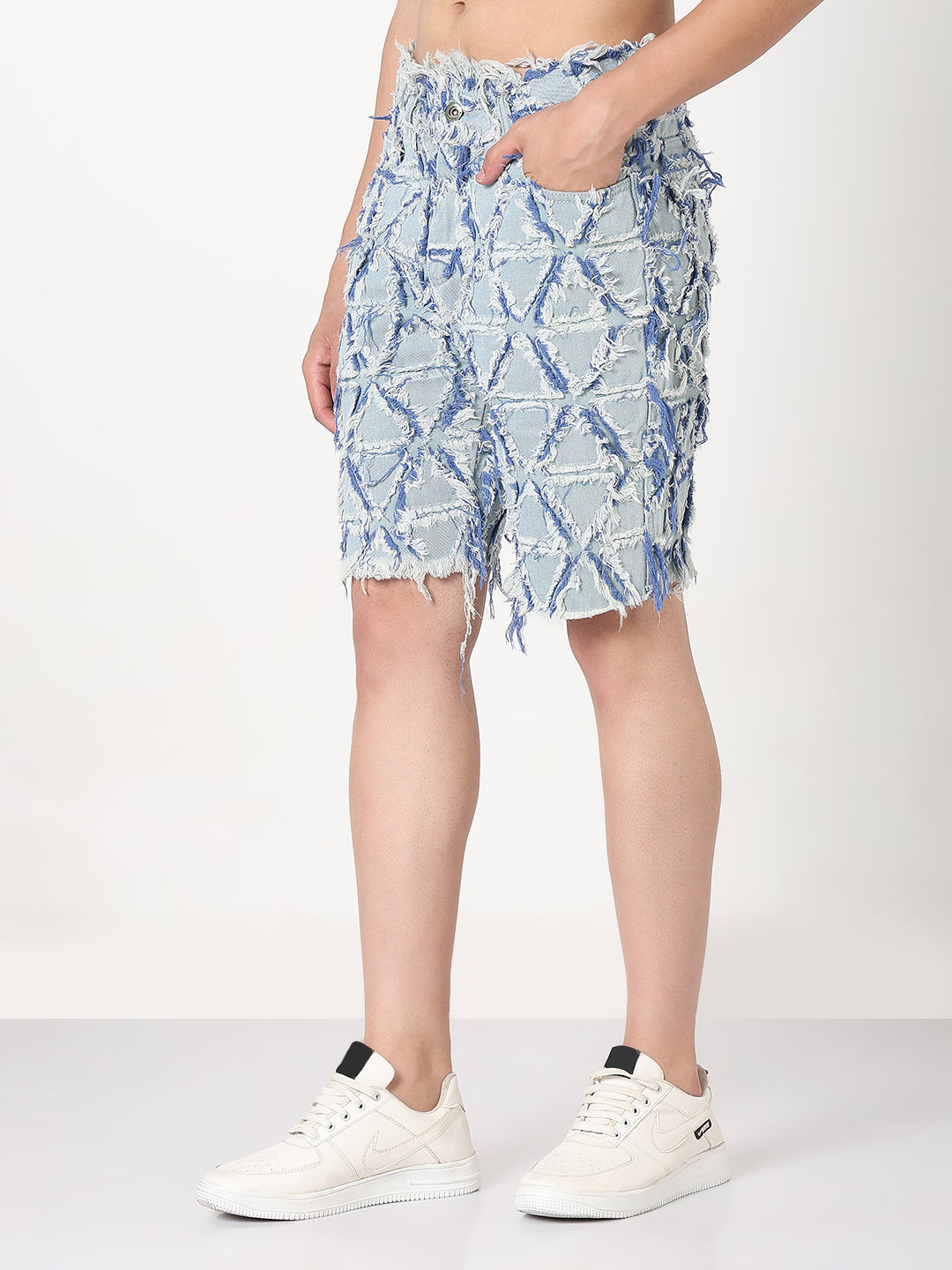 Elevate your summer wardrobe with our Men's Blue and Yellow Geometric Slim Fit Denim Shorts. These stylish denim shorts combine a contemporary geometric design with a comfortable slim fit. making them perfect for casual outings or beach days. Crafted from high-quality woven denim. these knee-length shorts are not just a fashion statement; they offer durability and style that's hard to beat.