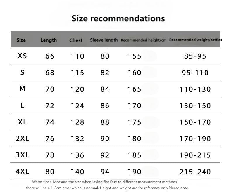 Size: XS 85-95 catties, S 95-110 catties, M 110-130 catties, L 130-150 catties, XL 150-170 catties, 2XL 170-190 catties, 3XL 190-215 kg, 4XL 215-240 catties